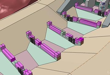 上图显示鱼梯的修改方式。粉红色是凹型槽的设计,而灰色的部份则是导流板的设计。