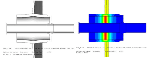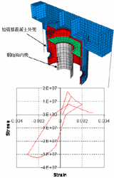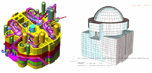 右图结构为日本核动力工程公司设计工程师采用Abaqus软件对相关核反应堆结构进行的应力分析。此类结构外层壳为预应力钢筋混凝土结构,内壳为钢板结构。分析目的是为了防止核容器壁在工作过程中出现开裂造成核泄漏。