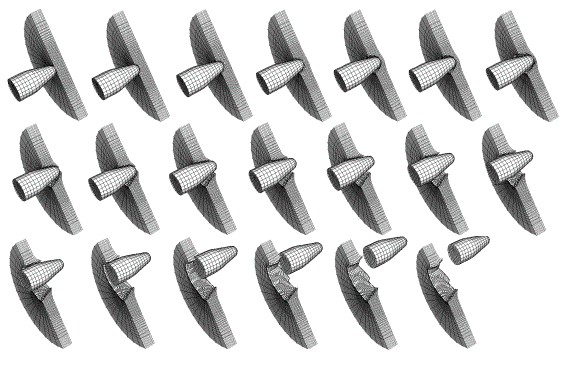 USS IOWA 事故的结构分析 (Finished by Sandia National Laboratories): 1989年4月19日美国USS IOWA战列舰2号炮塔发生无法解释的爆炸, 47名人员死亡。美国海军推断,推进炸药爆炸促成了击发拴座(rammermans seat)进入操作杆弧座(quadrant)或等效于在事故中拴的速度很低。本例用Abaqus/Explicit对击发拴座的运动进行分析。