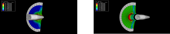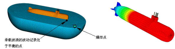 潜艇的水下爆炸模拟: Abaqus/Explicit具有强大的分析水下爆炸(UNDEX)的功能,下图左为潜艇处于深海中的三维立体模型,下图右为Abaqus分析的潜艇外壳受冲击后的应力等值线分布。