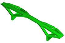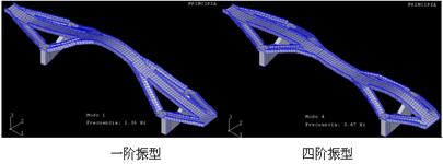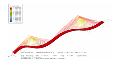 二、桥梁模态分析 Abaqus提供了两种求解振型的方法:Lanczos方法和Subspace两种方法,两种方法各有优缺点,分别实用于规模较大,频率提取多的结构和规模小,频率提取少的结构。右图桥梁长140m,高80m。其一阶和四阶振型如下图所示。
