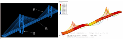 四、荆沙长江斜拉桥结构三维仿真 位于湖北省荆州市的荆沙长江公路大桥南汊通航孔主桥如下图所示,主跨布置成160+300+97m,桥梁全长557m,下图分别是利用Abaqus对该桥做的施工过程模拟、结构动力响应及地震响应分析结果。