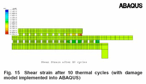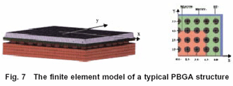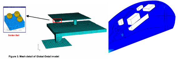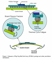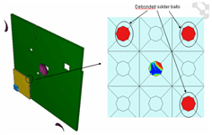 断裂和材料失效分析: Abaqus的断裂力学分析功能在商业求解器中是国际上公认的最强的,并且不断在客户推动下发展,最新功能包括粘结单元和虚拟裂纹闭合技术等工程断裂分析技术。此外,Abaqus可以很方便的进行材料剪切、拉伸、屈曲等工况下失效的模拟。这样为模拟芯片,模塑料等封装组件开裂问题提供了有力手段。右图是Intel公司和Abaqus合作,利用粘结单元模拟焊球和基板之间的开裂,对母板生产厂商提供设计标准。