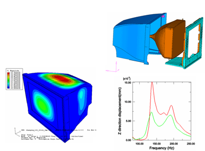 涉及的分析是一个无线光电鼠标从 1 米高的地方跌落的模拟。该分析主要研究电子构件在跌落过程中可能出现的故障。 在撞击区域和支持电路板凸起的底部有应力集中。在这些区域中的应力可采用子模型技术进行更详细的分析,利用子模型技术,整个模型得到的结果可以用来驱动某个区域中更小的、更详细的模型。 右图为分析结束时模型结构,连接件在大约 0.08 毫秒时损坏,引起外壳完全分离。 跌落模拟已经成为设计个人电子产品必不可少的工具。Abaqus/Explicit 的先进性使得这种加载情况很容易运用到设计过程中去。 电视机线性动力学分析 整个模型部件均以壳体单元模拟。 包括后壳,显像管,前壳三部分。前后壳为HIPS塑料,显像管为玻璃材料。在前后壳以螺栓及卡扣相连接,显像管与前壳以螺栓连接。分析的目的是找出电视机的共振点,合理优化设计,降低振动响应。 FPC是手机中容易发生破坏的部件之一,为破坏分析更加准确,结合FPC的实际结构,应用双层层结构来模拟FPC模型,材料模型选用五层二维各向异性层材料模型,并在层材料上采用分区处理以更加准确的模拟FPC的铜线层。 |